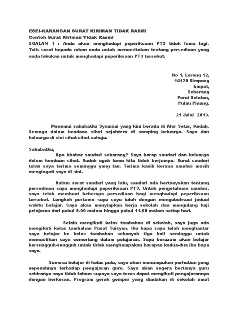 Contoh Karangan Tidak Rasmi PT3 Format Surat 1. Ada 2 kategori bagi karangan bahasa melayu ini iaitu karangan berformat dan juga karangan. SURAT KIRIMAN TIDAK RASMI June 25 2019 Azizah binti Mohamad.